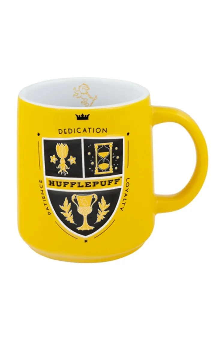 Enjoy your favorite beverage in this sleek, sculpted mug featuring the Hufflepuff House Attributes – Patience, Dedication, and Loyalty. Adorned in house colors, the design includes the house attribute crest on the front, with the corresponding attributes printed on the back, and the house crest on the interior lip.