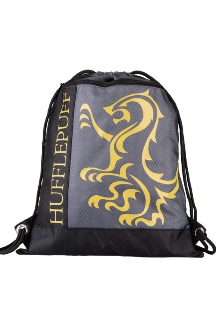Hufflepuff drawstring backpack with house mascot, colors, and name proudly displayed on front. Design is featured on lightweight, durable polyester material with a honeycomb stitched pattern, zippered front pocket, and black drawstrings.