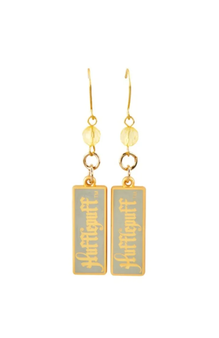 Elegant, drop earrings featuring matching Hufflepuff pendants with accent beads and matte, gold-tone finish.