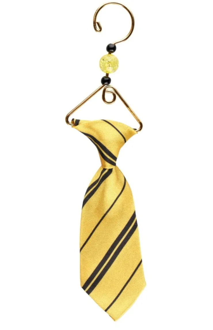 Hufflepuff house tie ornament complimented by a gold-tone metal hanger and jewel beads.Gold-tone metalSatin fabric5 3/4&…