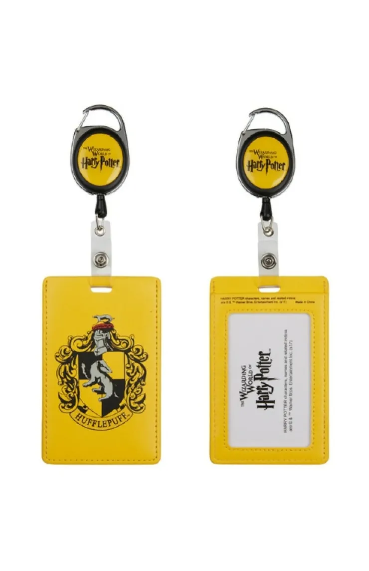 Retractable badge reel featuring the house crest of Hufflepuff, printed on faux leather card holder with clear window on reverse side from The Wizarding World of Harry Potter™.