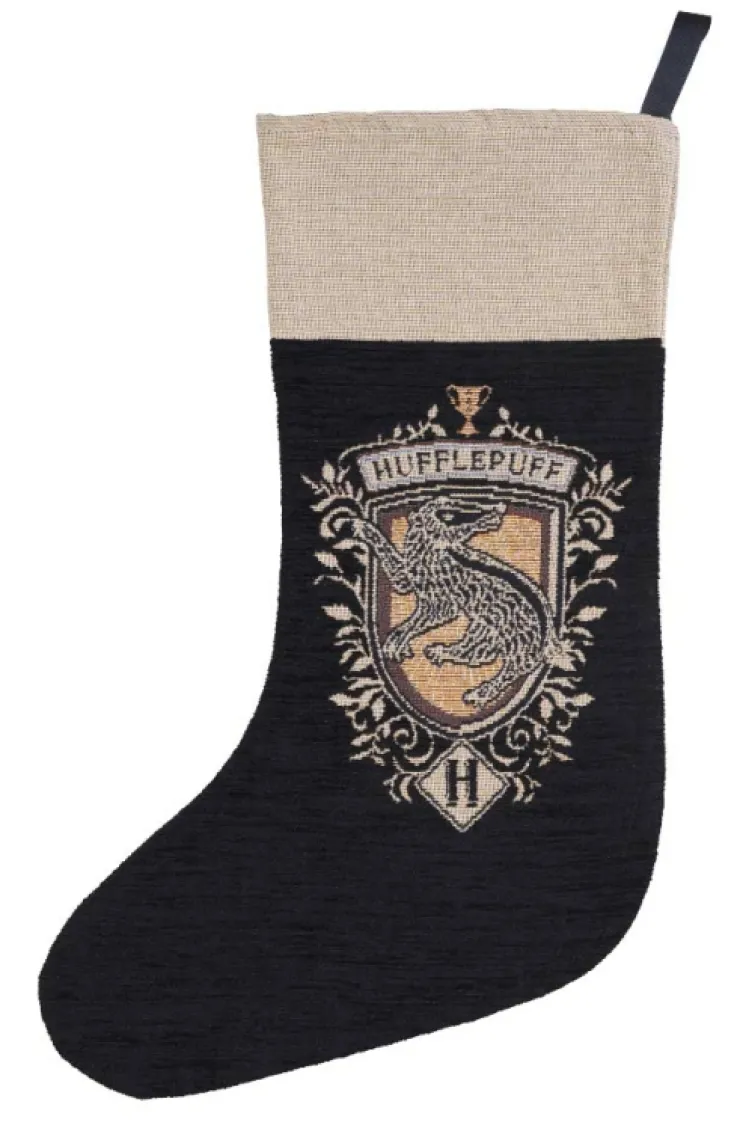 Add a touch of magic to your holidays with this chenille stocking featuring the Hufflepuff house icon and color. Woven design includes durable, sewn ribbon loop for hanging.