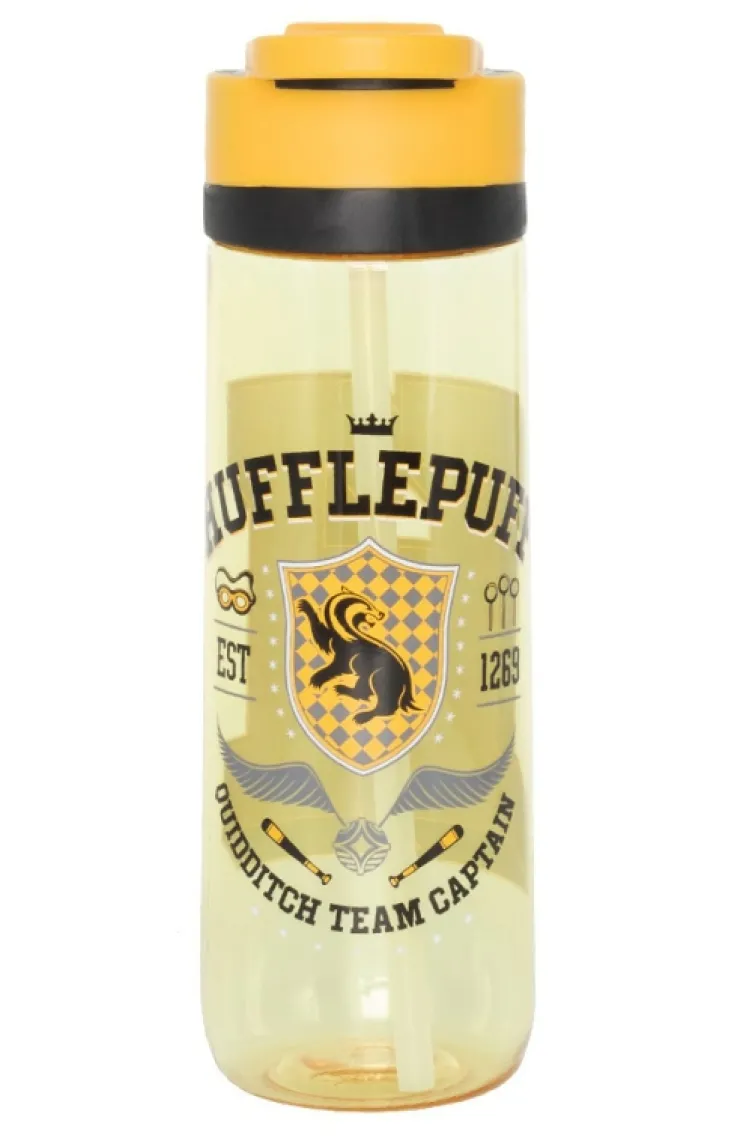 Hufflepuff Quidditch™ Team Captain travel bottle featuring the house colors and house icon as well as a button activated lid that pops out a straw.