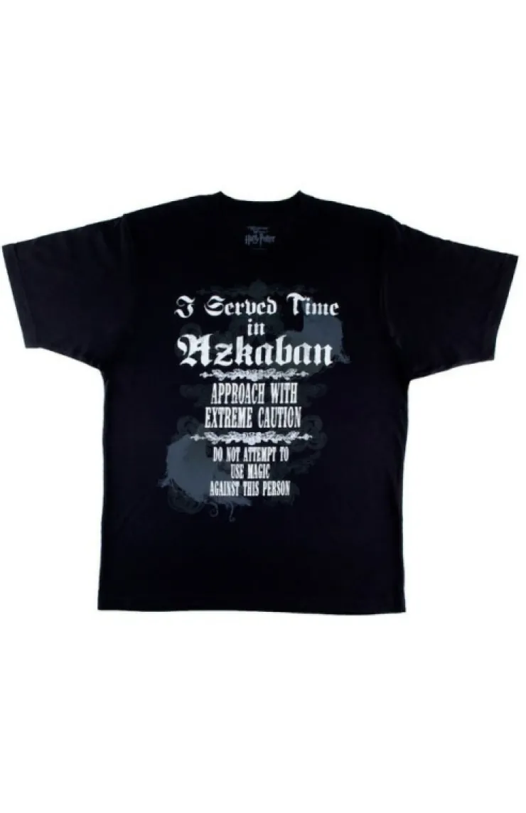 The printed design includes the copy “I Served Time in Azkaban” on this classic unisex, black tee shirt.