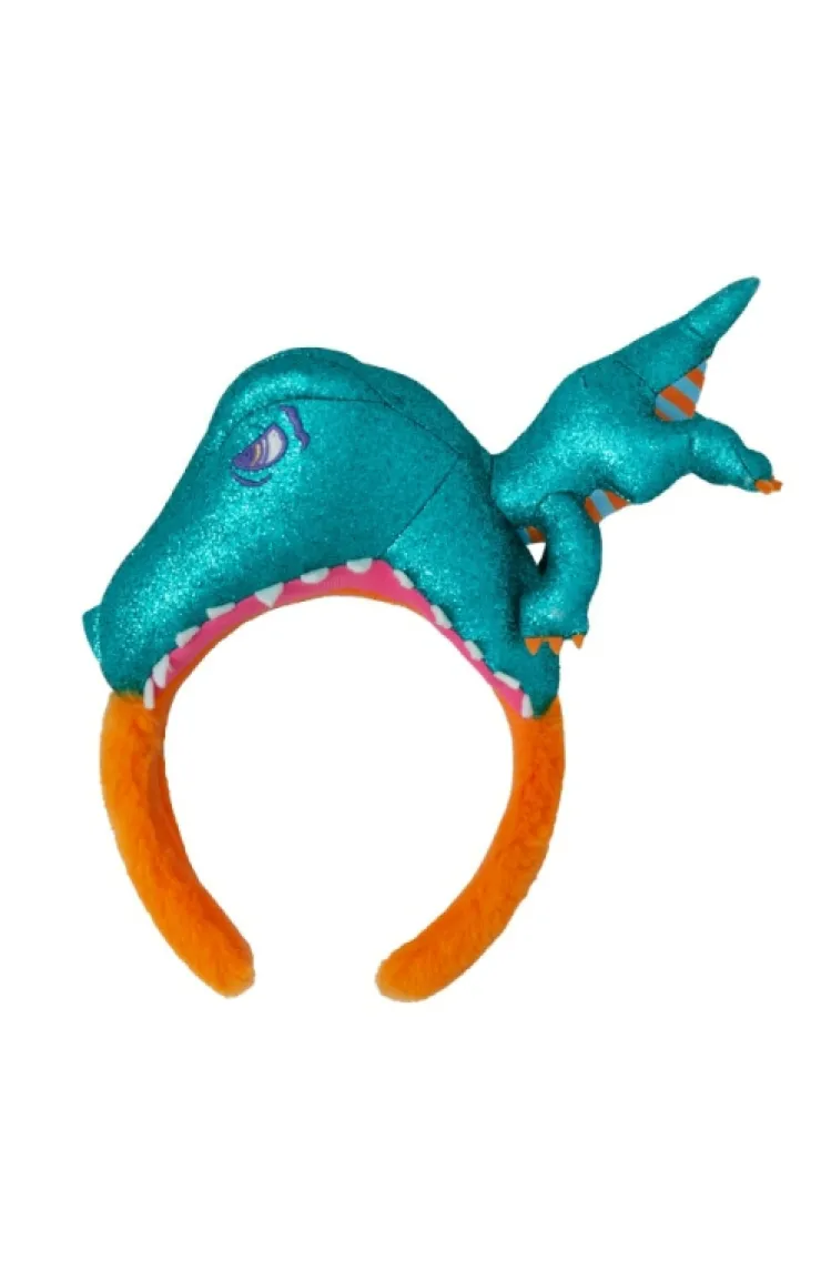 Jurassic Park dino bite headband featuring an adorable sparkling blue plush dinosaur having a little nibble on your noggin, attached to an orange faux fur band for comfortable wear.
