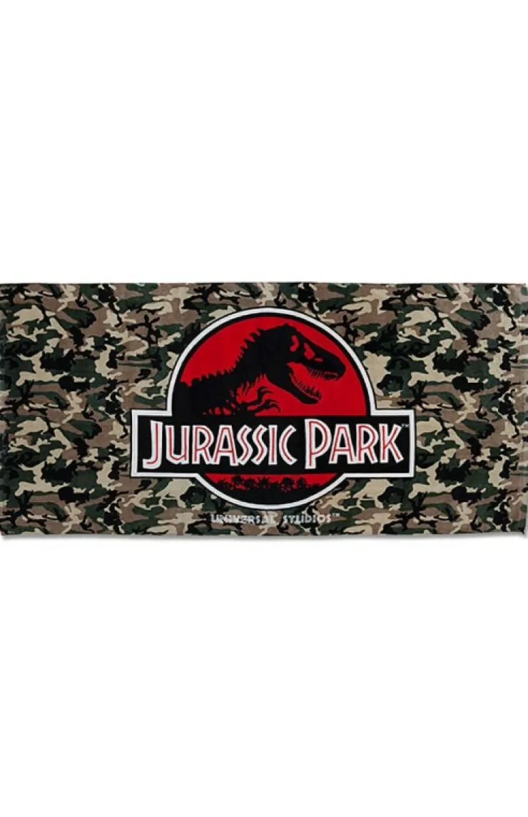 Great for drying off at any dino watering hole, this beach towel features an extra large, iconic Jurassic Park logo over forest floor camouflage background.