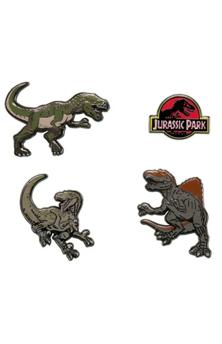 Don’t let these miniature dinos fool you. The Jurassic Park logo accompanies 3 familiar dinosaurs in this fearsome pin set.