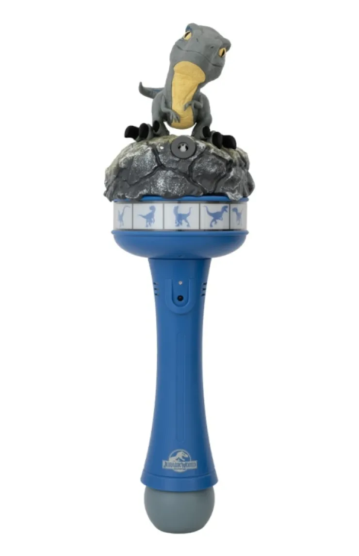 Jurassic Park parade bubble wand featuring the velociraptor Blue. Wand features multi-colored flashing lights and sound.