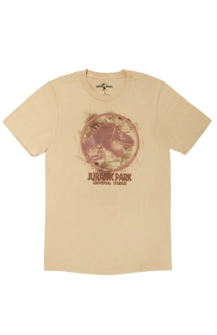 Comfortable adult t-shirt featuring the iconic Jurassic Park logo from the film that started it all. Design has raised faux-leather logo over a rocky background screen printed on lightweight, khaki garment.