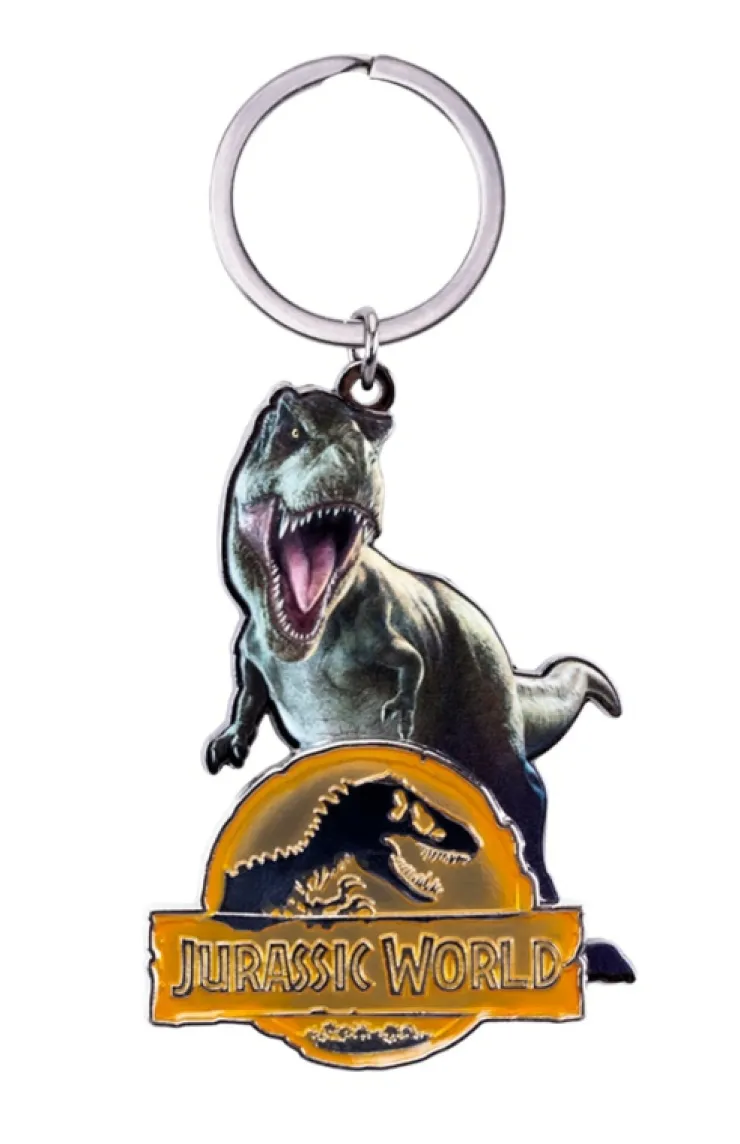 Keep your keys safe and protected by the mighty T-Rex with this Jurassic World keychain. Design features a menacing printed T-Rex over an enamel filled Jurassic World amber logo on a silver and black-toned metal.