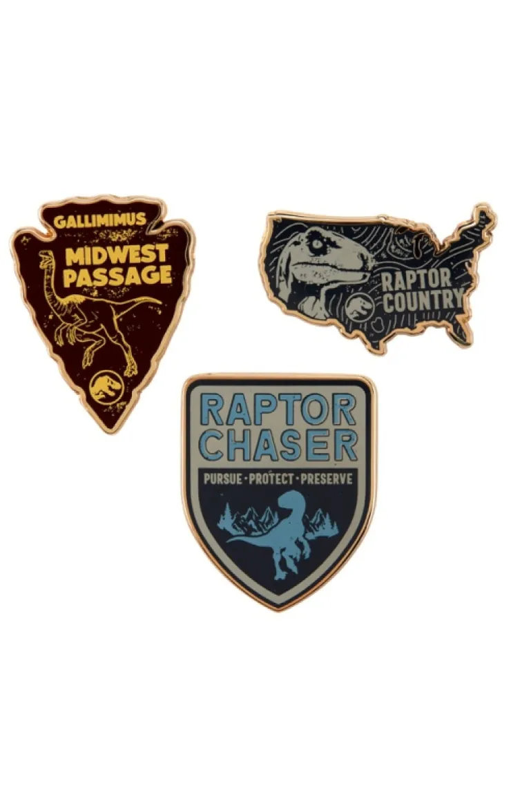 Jurassic World miniature pin 3-pack featuring "Gallimimus Midwest Passage", "Raptor Country", and "Raptor Chaser – Pursue  Protect  Preserve".