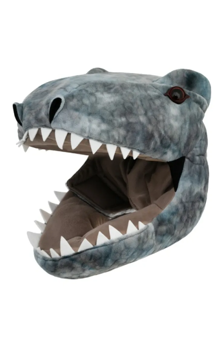 Jurassic World novelty hat featuring a gray plush dinosaur taking a bite with adjustable strap for comfortable wear.