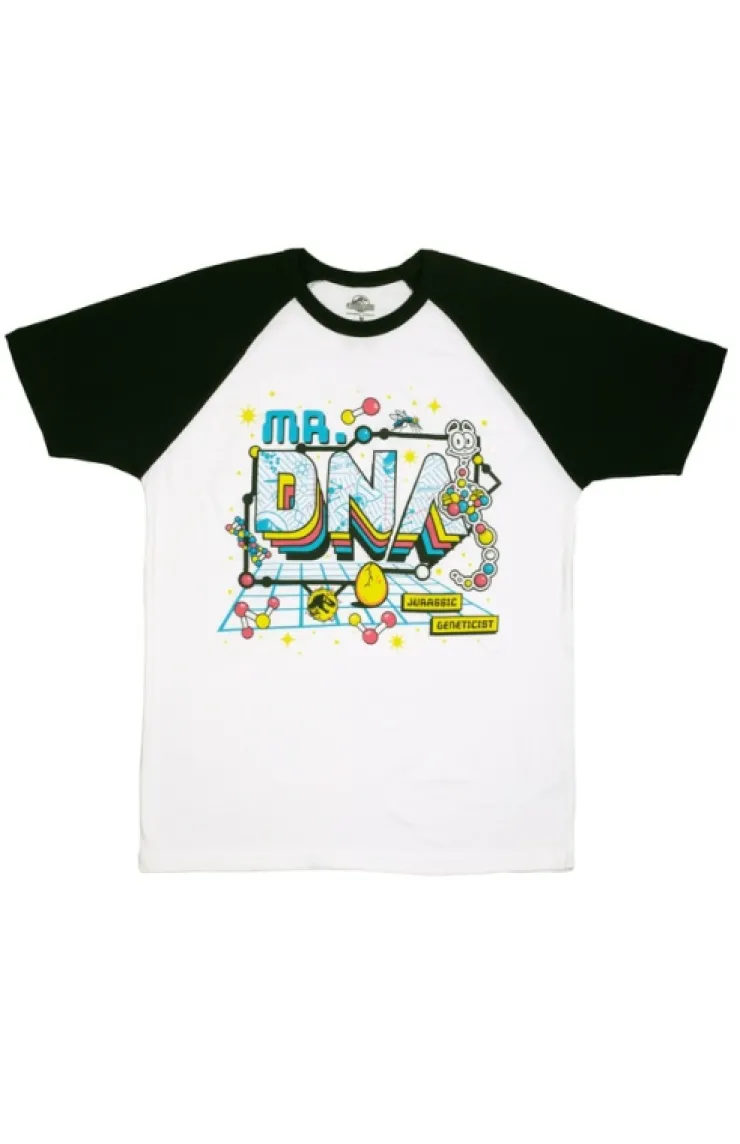 Jurassic World adult t-shirt featuring vibrant artwork of Mr. DNA and "Jurassic Geneticist" below. Design is screen printed on solid white garment with contrasting black, raglan sleeves.