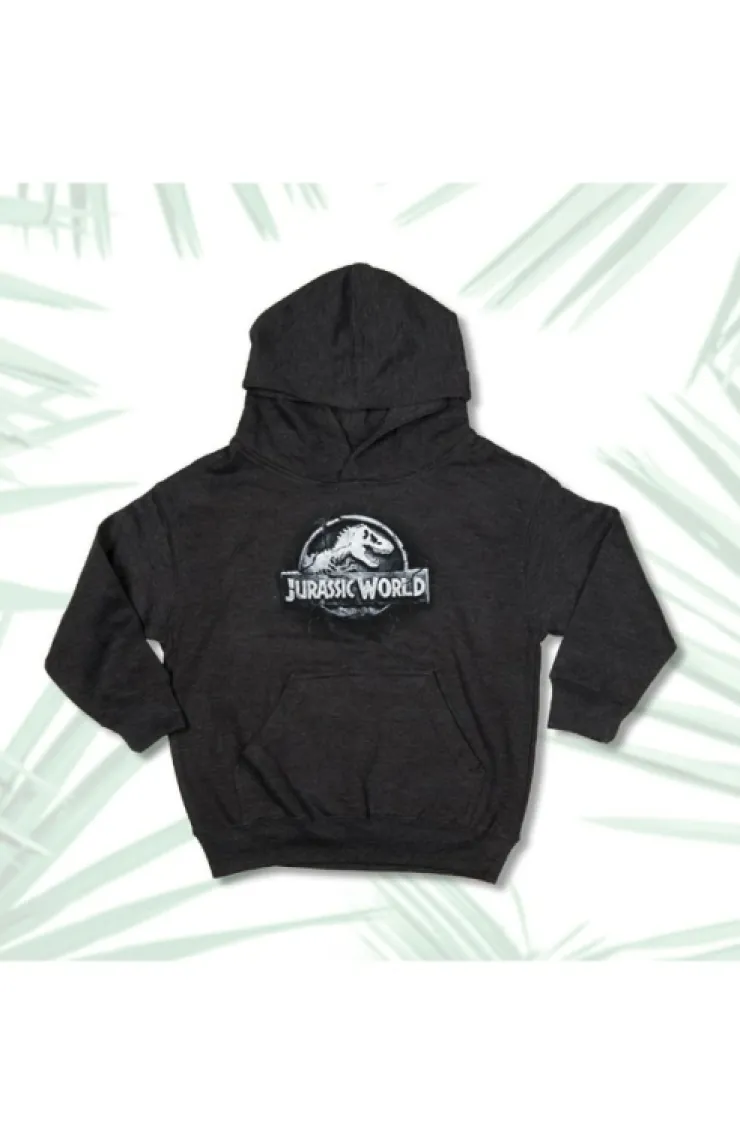 An updated take on a classic, pull-over hooded sweatshirt features screen printed Jurassic World logo against solid charcoal garment.