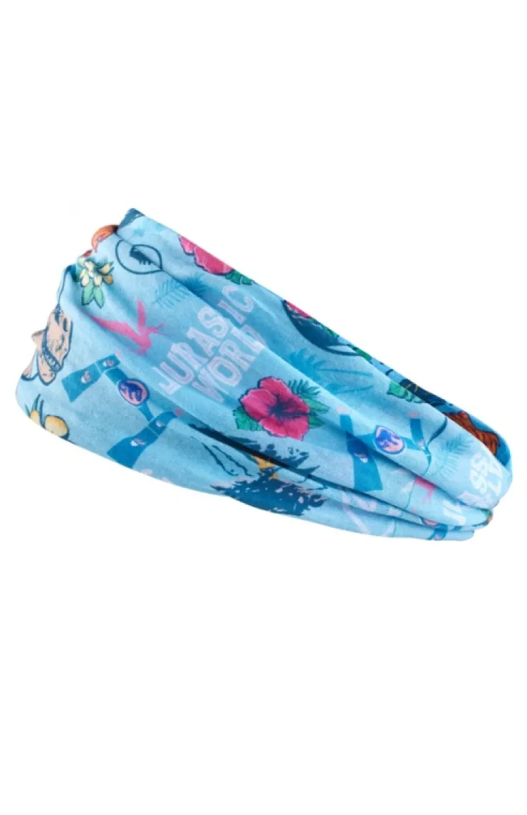 Jurassic World headband featuring patterned imagery of dinosaurs, volcanoes, flowers, and the iconic Jurassic World entranceway. Design is sublimated on lightweight, versatile material that can be styled and worn in multiple ways.