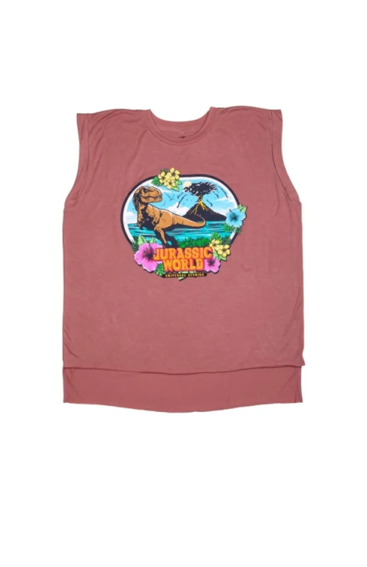 Dress for adventure in this trendy and lightweight, Jurassic World ladies t-shirt featuring stylized artwork of a T. Rex with a volcanic mountain in the distance. Floral design is screen printed on the front of soft, comfy mauve shirt body with flattering tiered trim and hemmed sleeves for an additional fashion touch.