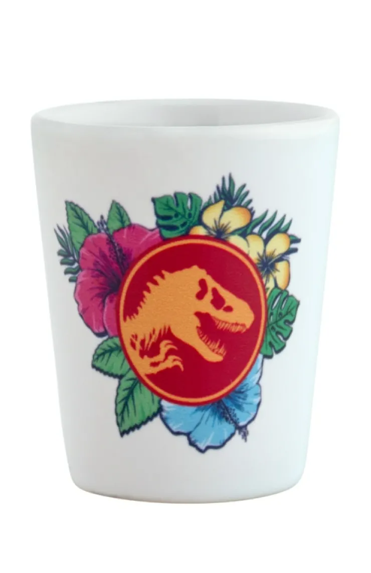 Toast to your prehistoric adventures with this tropical themed shot glass, featuring a floral Jurassic World logo against a glossy white finish.