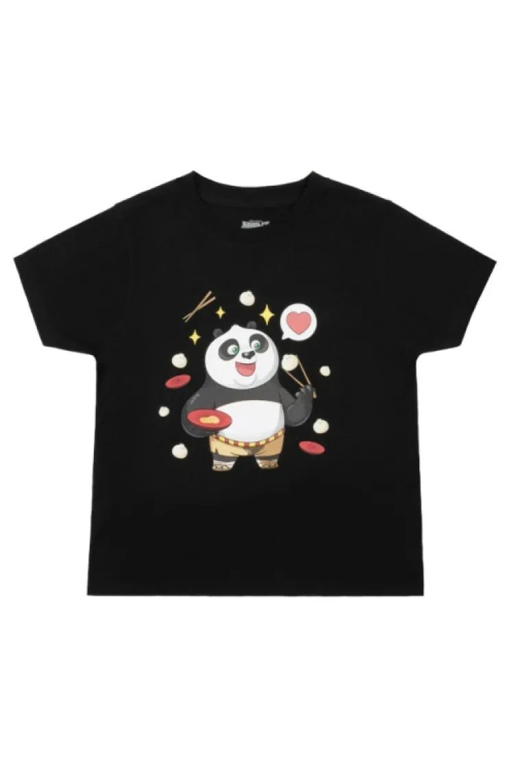 Kung Fu Panda youth t-shirt in the color black featuring an adorable Po eating dumplings with "Powered by Dumplings" across the back.
