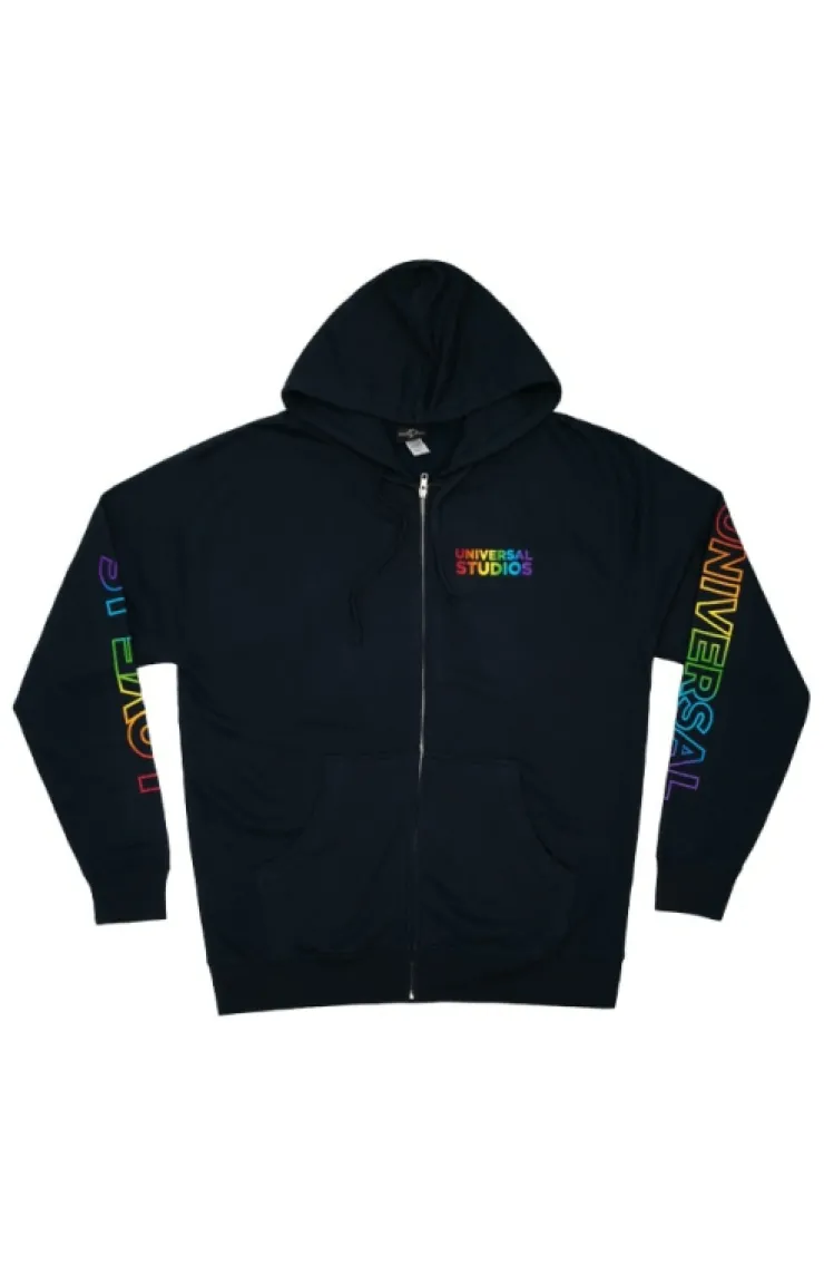Show your support with this Love is Universal zip-up hooded sweatshirt in the color navy blue featuring "Universal Studios" in rainbow colors on the front left side with "Love is" across the right sleeve then continuing down the left sleeve with "Universal".