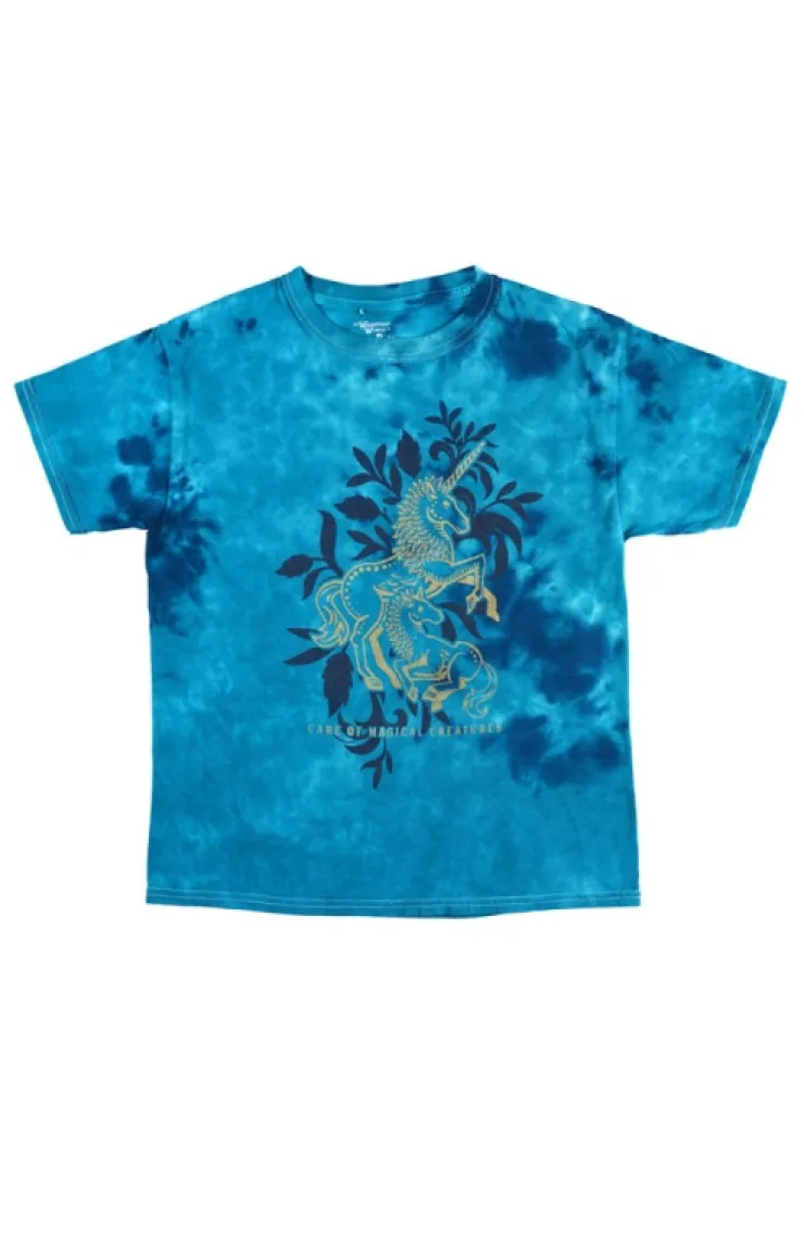 From The Wizarding World of Harry Potter™ a lightweight, youth t-shirt featuring the mother and baby unicorn seen on Hagrid’s Magical Creatures Motorbike Adventure™, screen printed in gold foil on teal tie-dye fabric.