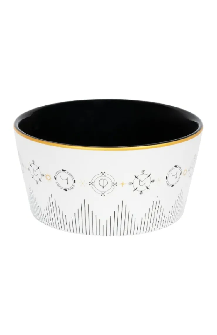 Ceramic stoneware bowl featuring a wraparound design of various spells from The Wizarding World of Harry Potter™ with gold-tone accents and trim for an elegant touch. Includes one bowl. Mix and match with other pieces of the Magical Spells Dinnerware Collection to create your own set!