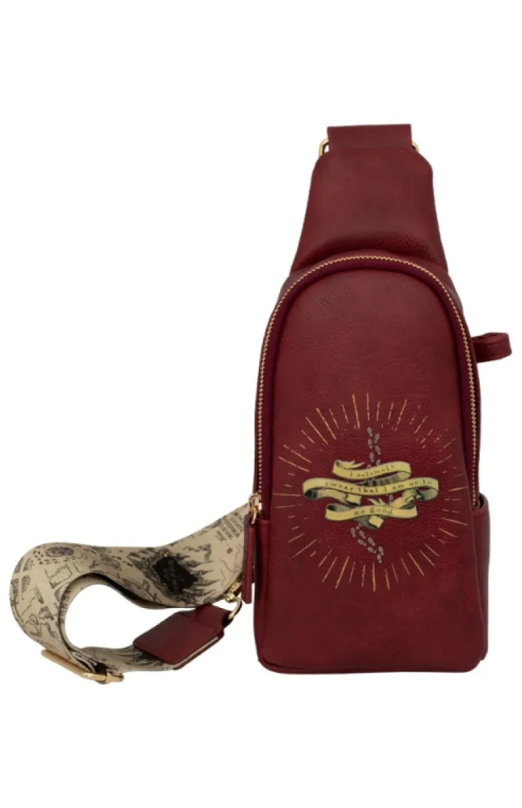 Marauder's Map sling bag in the color burgundy featuring "I Solemnly Swear That I Am Up To No Good" across the front with adjustable strap that features an allover print of the iconic Marauder's Map.