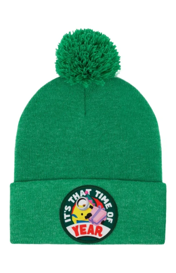 Minion holiday beanie in the color green featuring a festively dressed Stuart with "It's That Time Of Year" across the front.