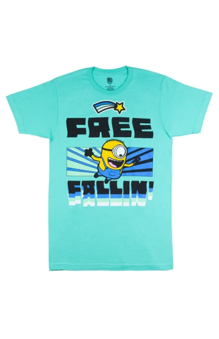 You'll lose your mind for this minion free falling adult t-shirt. Screen printed design features vibrant artwork on the front and stylish minion text across the upper back of soft, light blue garment.