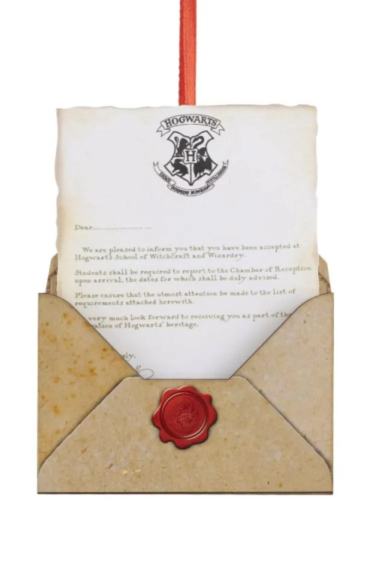 Customize your holiday with this Hogwarts acceptance letter ornament. Features a removable letter insert that you can personalize, accented with a scarlet ribbon for hanging.