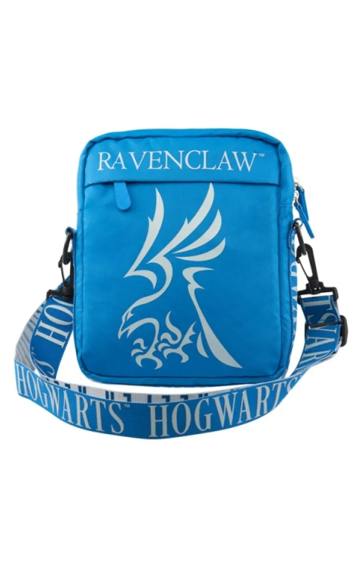 Represent Ravenclaw with this easy-to-carry crossbody bag featuring the Ravenclaw house icon and colors. Design has two exterior zippered compartments, one additional exterior pocket, one interior zippered pocket, and an adjustable shoulder strap with clips that reads "Hogwarts™" on the outside and "Keeper" along the interior.