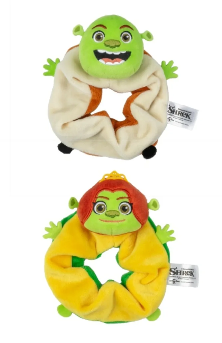 Shrek & Fiona scrunchie set featuring adorable plush faces in a cute cartoon design.