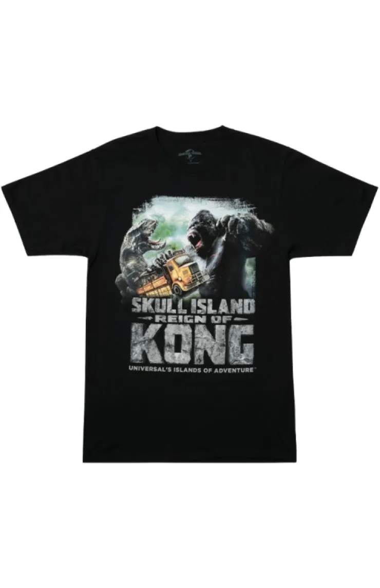 You made it off Skull Island alive! Commemorate your survival with this "Skull Island Reign Of Kong" T-Shirt. Featuring a T-Rex and King Kong fighting it out with your expedition truck caught in the middle.