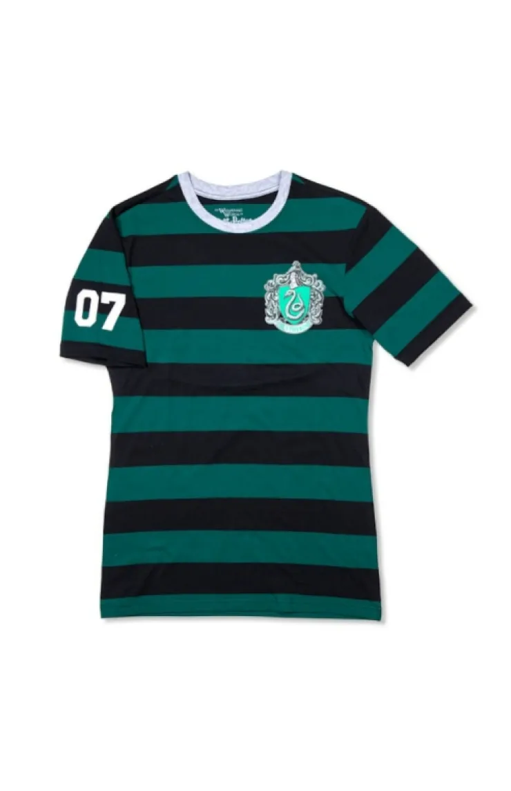 Adult t-shirt featuring the Slytherin house crest on front and Quidditch™ numbers "07" on the right sleeve. Green and black striped garment with a heathered grey neckline. From The Wizarding World of Harry Potter™.