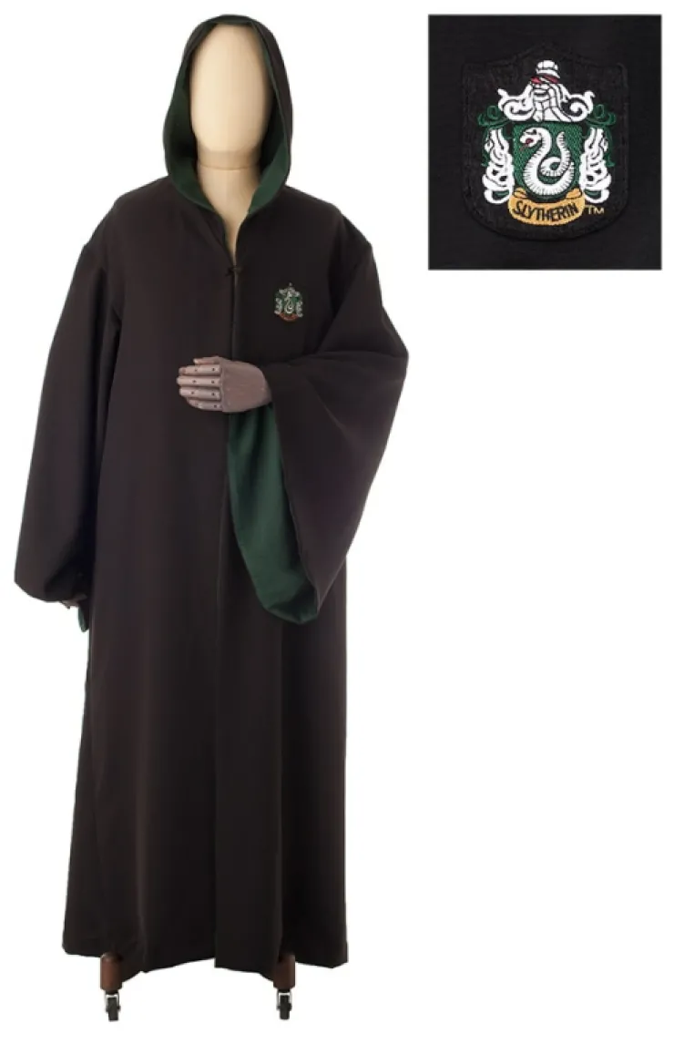 This authentic Slytherin robe has contrasting green lining, pockets, and features an embroidered patch of the house crest.