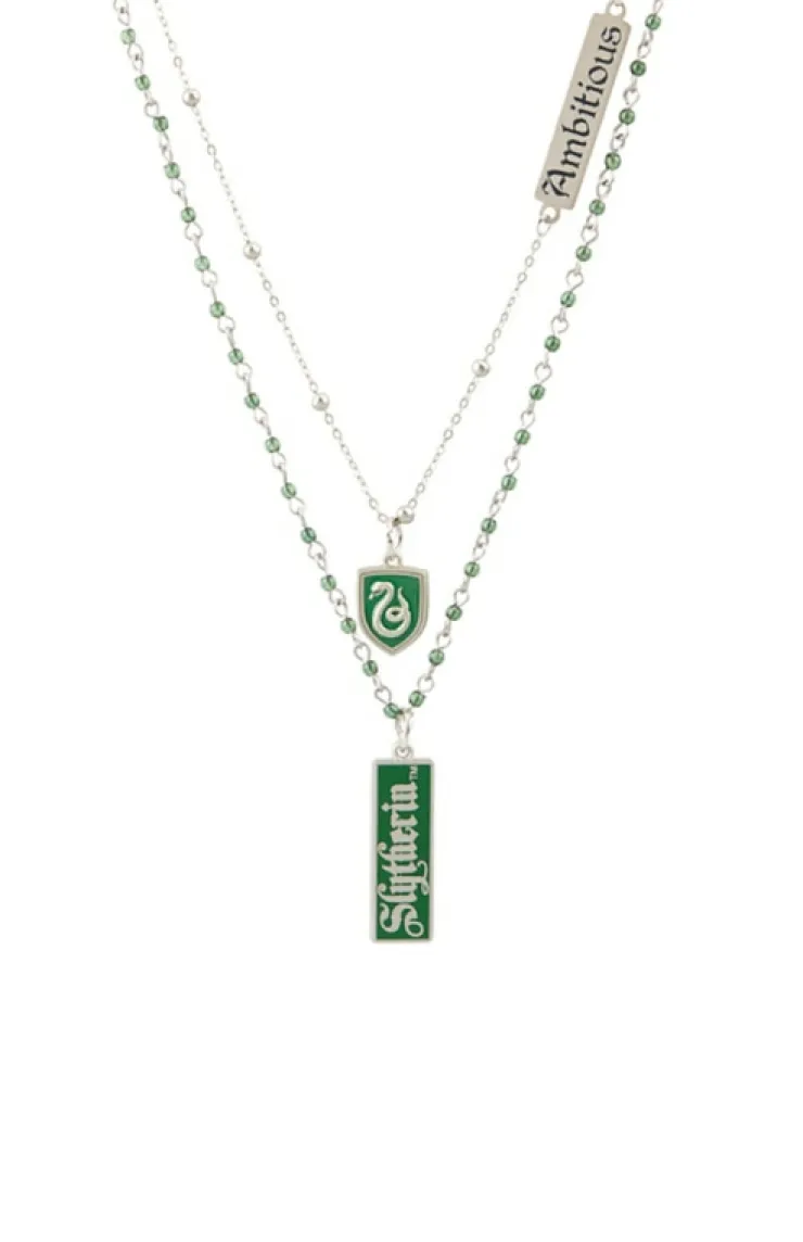 Beautiful, tiered necklace featuring charms of the Slytherin house shield and "Ambitious" on a beaded, silver-tone chain. Second tier features a Slytherin pendant, and is complemented by colorful accent beads spaced along a lightweight, silver-tone chain.