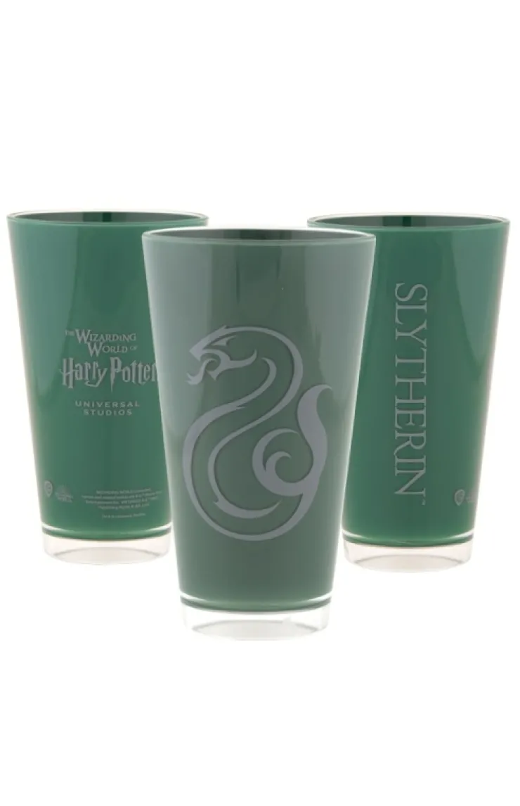 Enjoy your favorite beverage in this Slytherin tumbler featuring house colors, name, and house emblem. Wrapped decal design is accented by "The Wizarding World of Harry Potter™ – Universal Studios" logo on back of a green, acrylic tumbler.