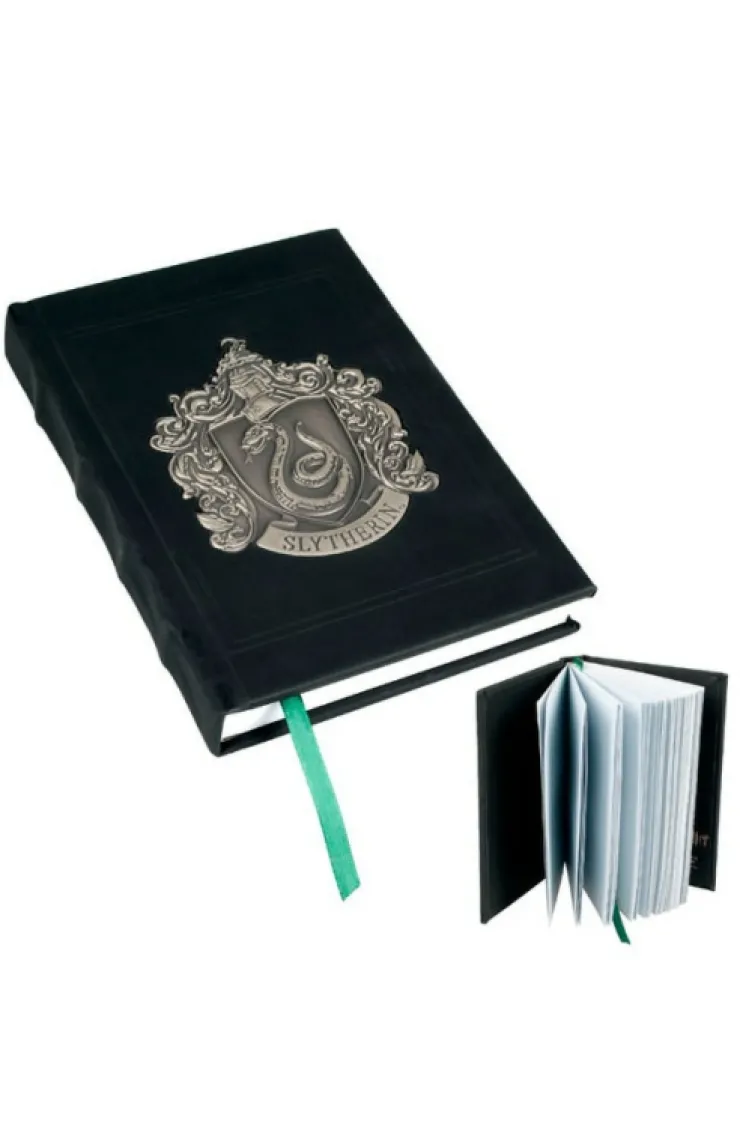 This journal features a silver metal Slytherin crest on a black faux-leather cover. A green ribbon marks your place within the grey pages.