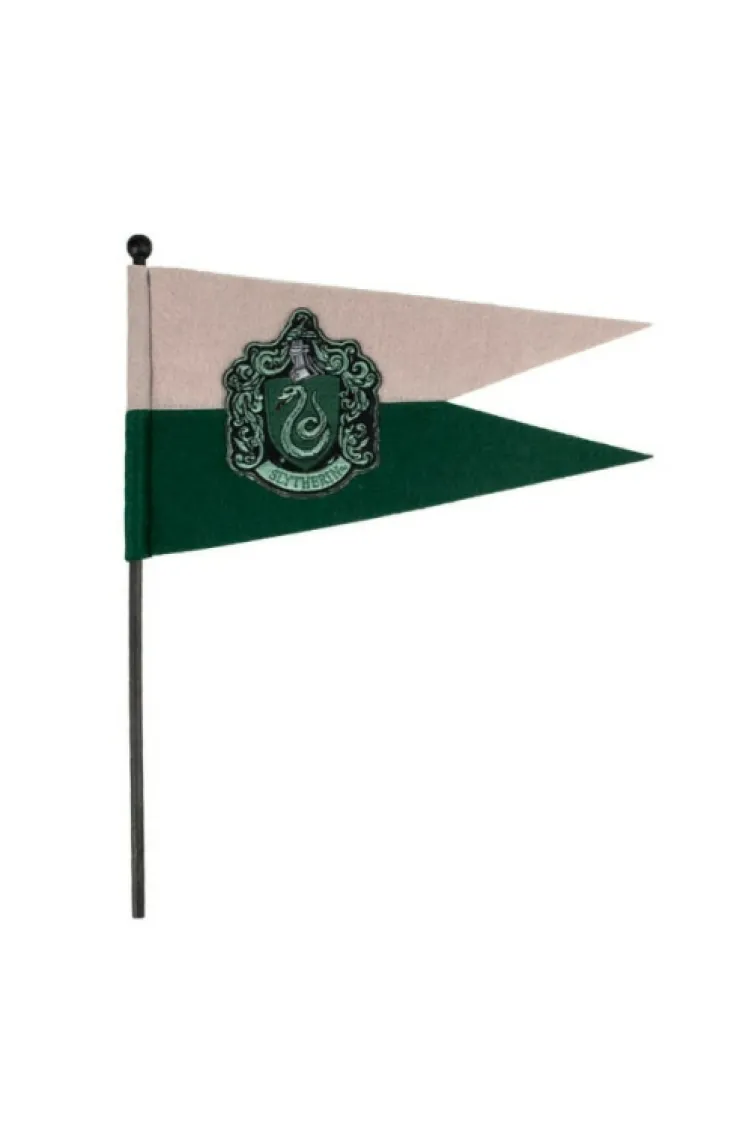 This pennant resembles those seen waved by Hogwarts™ students at Quidditch™ games in the films. Displayed on a sturdy, 16-inch wooden stick, the green and silver felt pennant features a fully embroidered Slytherin™ house crest.
