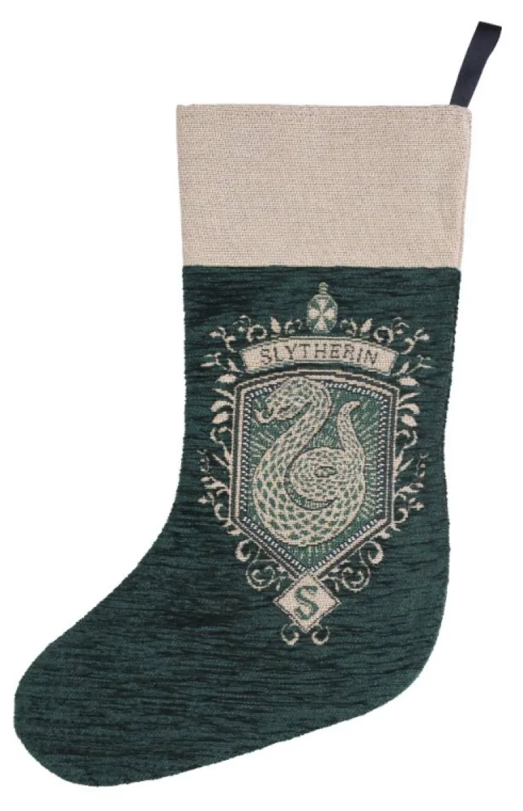 Add a touch of magic to your holidays with this chenille stocking featuring the Slytherin house icon and color. Woven design includes durable, sewn ribbon loop for hanging.