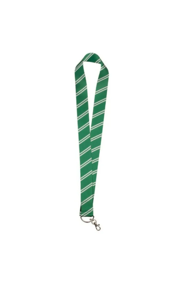This green Slytherin lanyard sports silver pin stripes and lies flat. Includes metal clip for keys, badges and similar i…