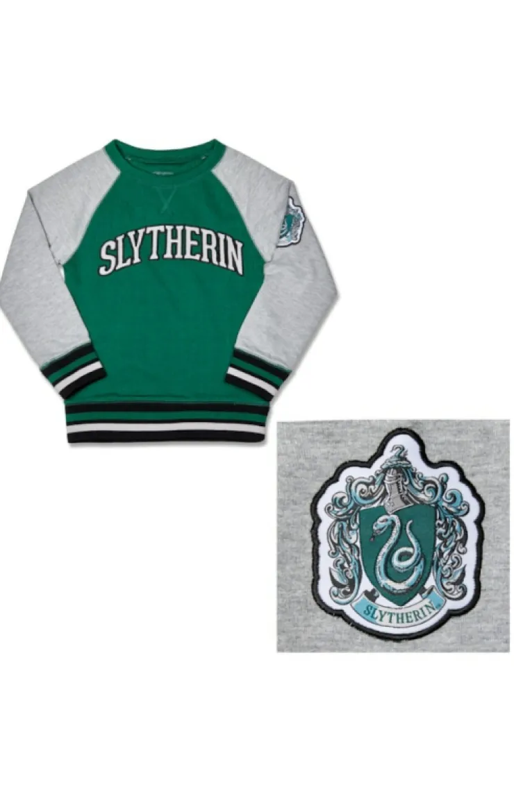 Slytherin crew neck youth sweatshirt with house name appliquéd on color-blocked body, and woven house crest on left sleeve from The Wizarding World of Harry Potter™. Comfortable, tri-tone sweatshirt with raglan sleeves features house colors striped along ribbed cuffs and waistband for an additional fashion touch.