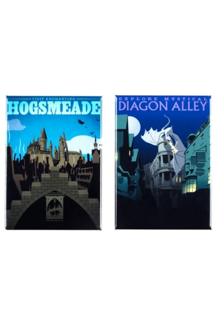 Magnet set featuring "Visit Enchanting Hogsmeade™" and "Explore Mystical Diagon Alley™"….