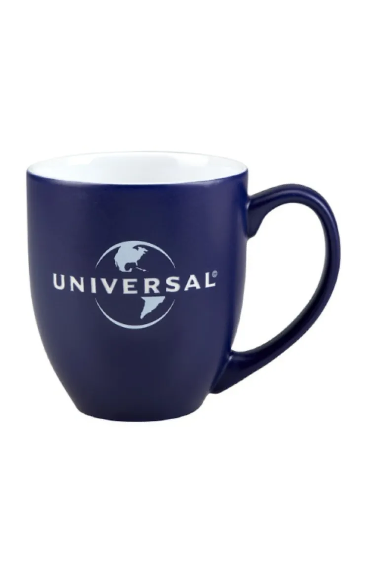Universal etched globe logo on blue matte ceramic give this bistro style mug an elegant finish.