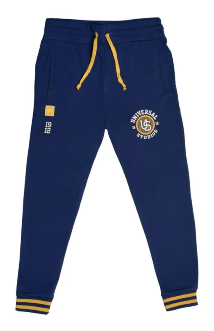Show your collegiate spirit with some comfortable Universal Studios 1912 drawstring lounge pants. Design is printed against soft navy fabric with yellow accents.