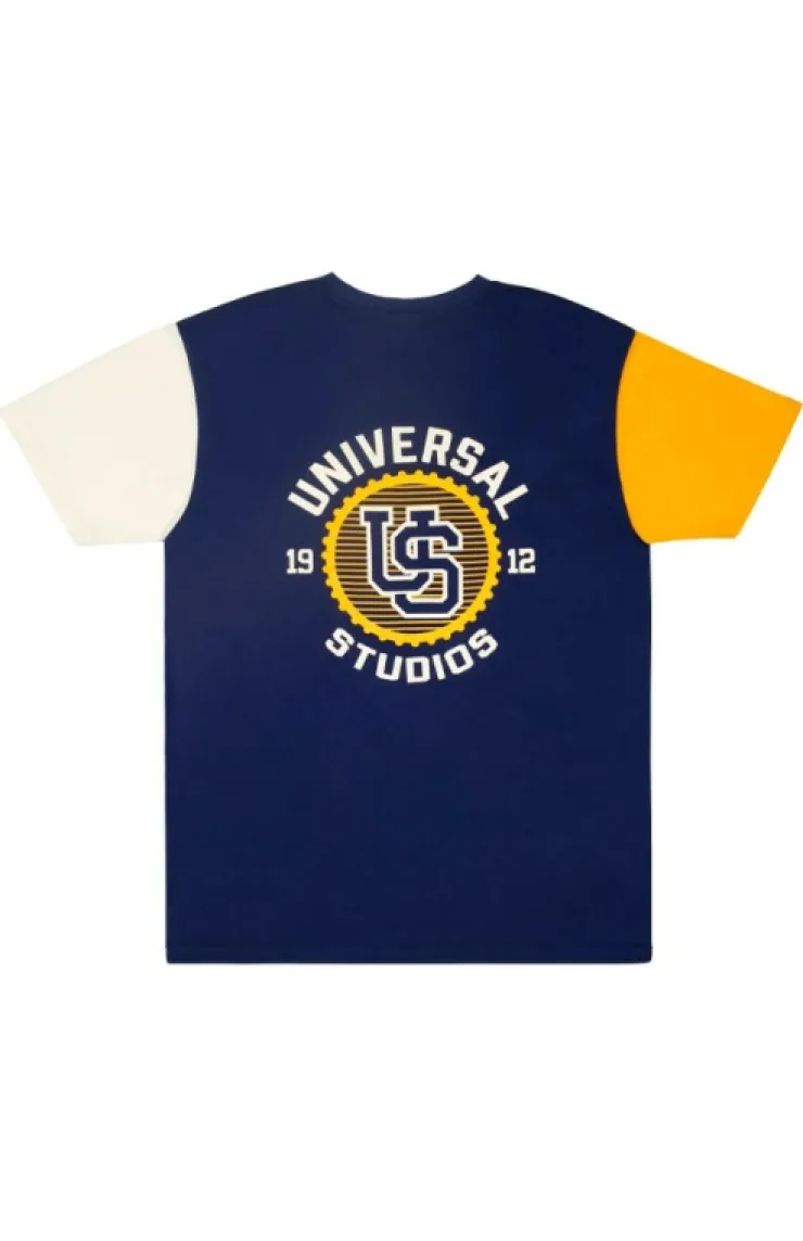 Show your collegiate spirit with this Universal Studios 1912 adult T-shirt. This shirt features a Universal Studios patch on the front, color block design and print for the back.