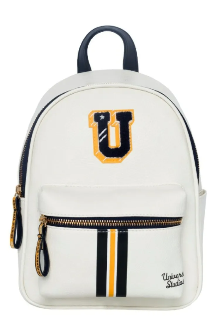 Show your collegiate spirit with this Universal Studios 1912 cream colored miniature backpack. Bag features faux-leather body gold and blue accents, zipper front compartment, zipper main compartment with zipper interior pocket and adjustable straps.