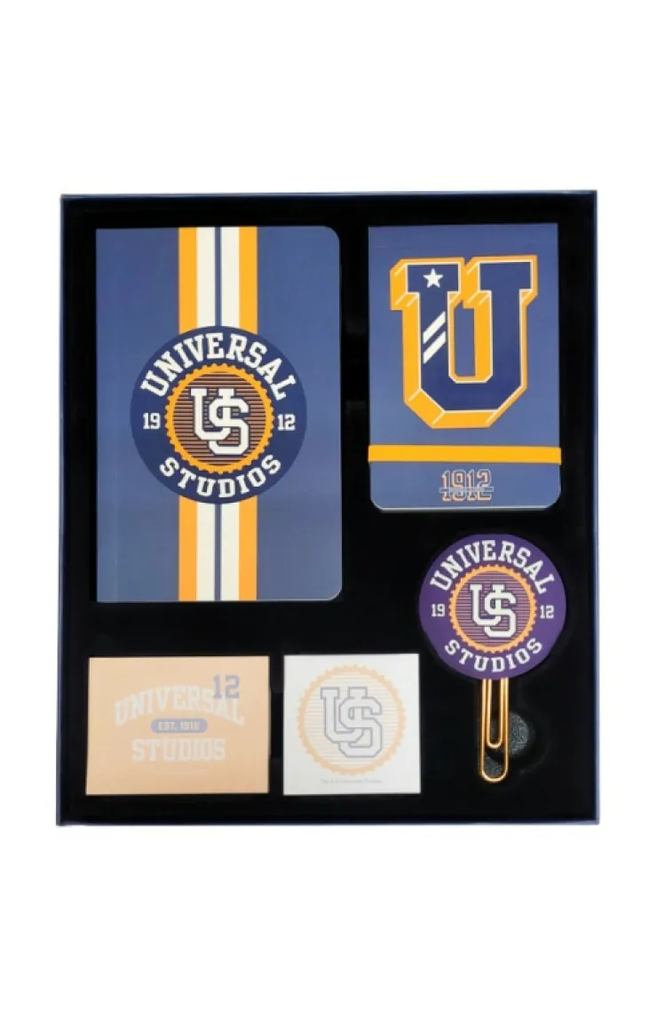 Show your collegiate spirit with this Universal Studios 1912 stationary box set. This set includes a lined notebook, two flip notebooks, sticky notes and a bookmark all with the 1912 design.