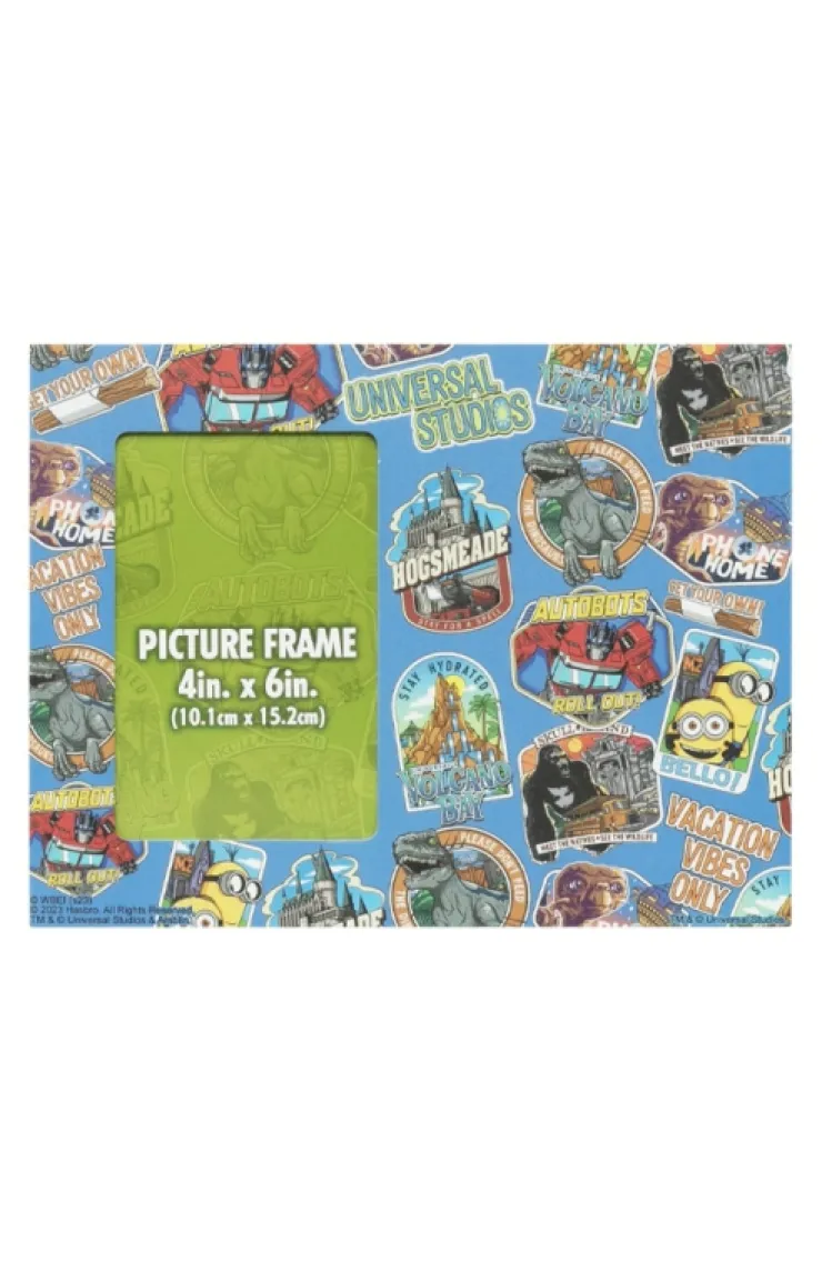 Universal Studios photo frame with a fun multi-character collage design featuring various characters from throughout the Universal theme parks.