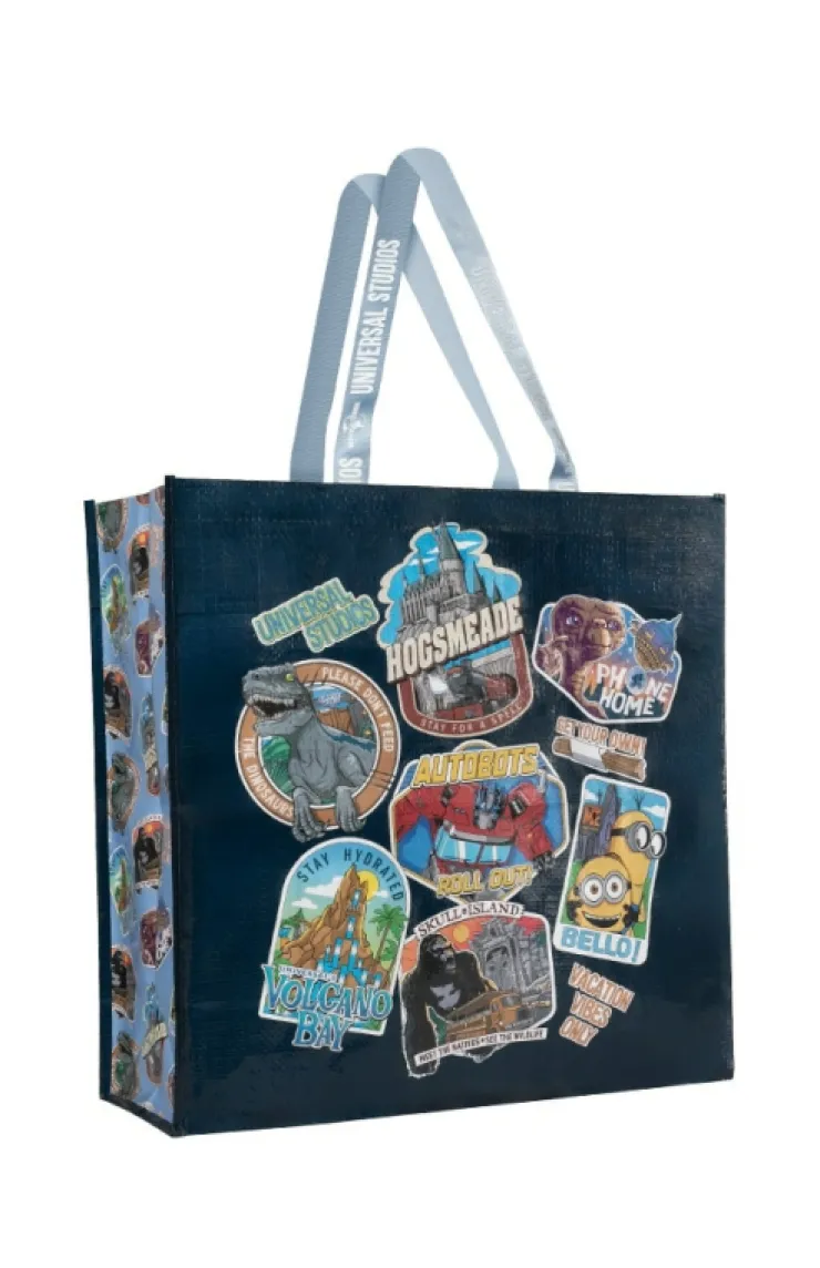 Universal Studios reusable tote with a fun multi-character collage design featuring various characters from throughout the Universal theme parks.