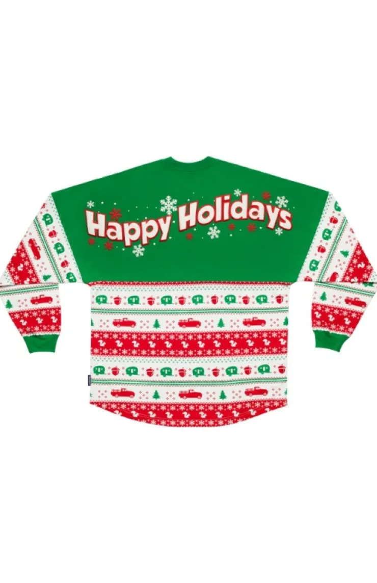Universal Studios adult Spirit Jersey® featuring Earl the Squirrel on a festive fair isle pattern with "Happy Holidays" across the back.